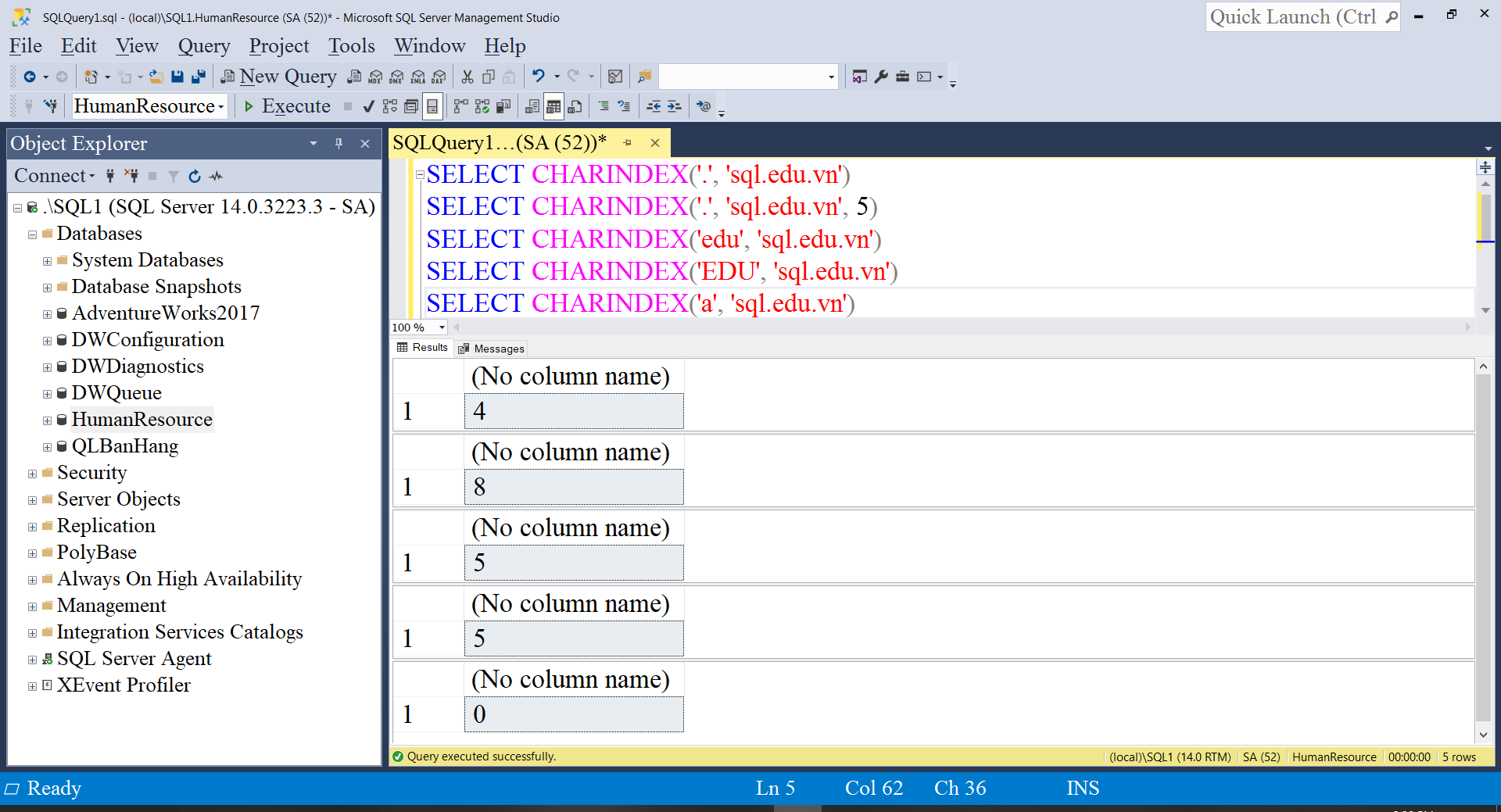 Hàm CHARINDEX trong Microsoft SQL Server tìm chuỗi tính từ vị trí bắt đầu trong biểu thức và trả về vị trí tìm thấy, không phân biệt chữ thường chữ hoa.