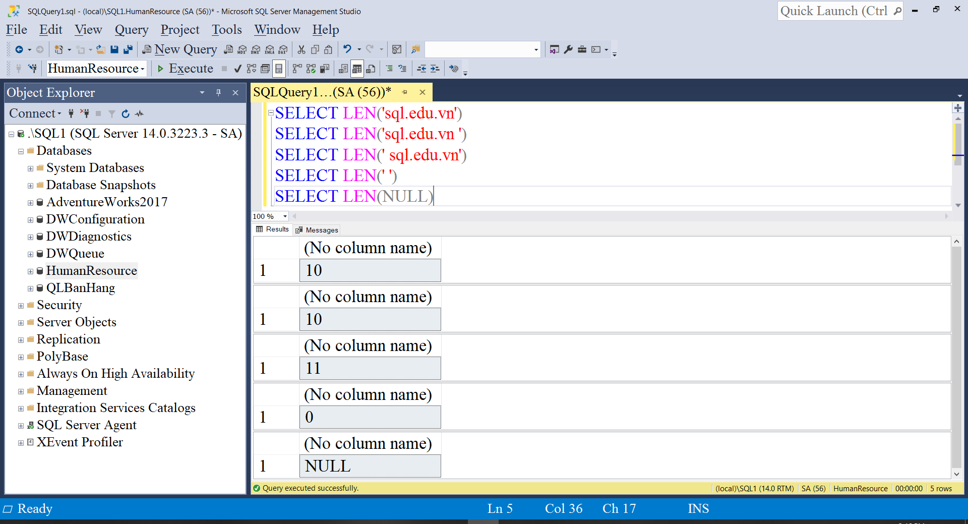 Hàm LEN trong Microsoft SQL Server không đếm các khoảng trắng ở cuối, không đếm biểu thức chỉ có khoảng trắng, trả về NULL nếu biểu thức là NULL.