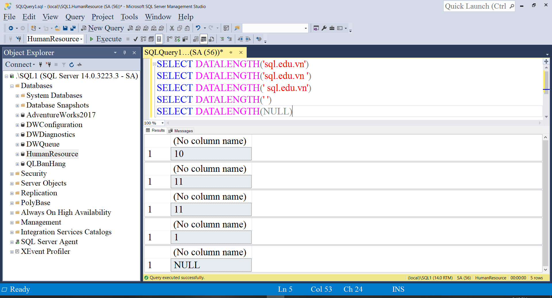 Hàm DATALENGTH trong Microsoft SQL Server đếm luôn các khoảng trắng ở cuối, đếm luôn biểu thức chỉ có khoảng trắng, trả về NULL nếu biểu thức là NULL.