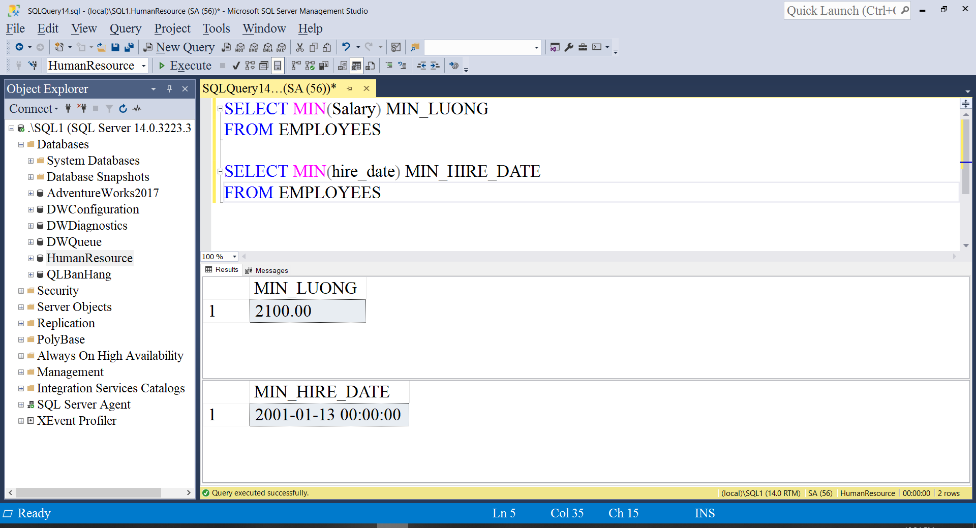 Hàm MIN trong Microsoft SQL Server dùng để lấy ra dòng có giá trị nhỏ nhất, nếu biểu thức là NULL thì hàm trả về NULL.